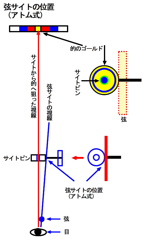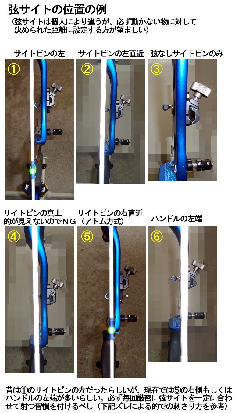 | このホームページのタイトルである弦サイトの厳格についての検証を机上論で述べてみます。弦サイトの狙いは個人により違ってくるが、毎回同じ箇所で狙わないと的に刺さるときには、弦サイトの位置がほんの1ミリ違うだけで大きく違ってきます。いわゆる弦サイトの厳格化について徹底しなければ上達はできないという趣旨です。下記写真類は個人により違ってくる位置の説明紹介ですが、下側は弦サイトの位置が1ミリ・2ミリ・3ミリ左へズレた場合の的への影響を模擬化した物です。他と同じようにあくまでも机上論として楽しむ程度にして下さい。しかし上達するには弦サイトの厳格化は必須です。 計算は今回も高度計算サイトで、距離(84cm)とズレ(1・2・3ミリ)の数値を入力したら角度がわかり、その角度の数値を利用して50m先まで延長し的でのズレを決定模式図化しました。 |