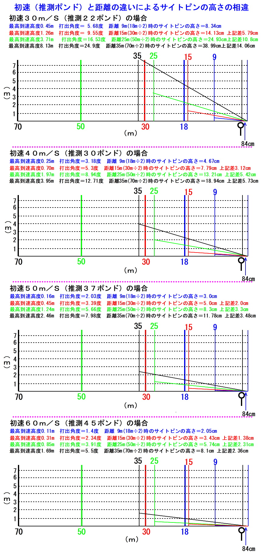 | このホームページの表題である弦サイトと関連性のある実際のサイトピンについて推測と計算をしてみました。 初速(推測ポンド数)と的までの距離(半分に位置する最高到達高度)の違いによる、弦から約84cm前方に位置するサイトピンの高さがどの程度変化するのかを高度計算サイトを使って検証しました。放物線を描くアーチェリーの矢は、到達までの距離で初速と打出角度が決まれば最高到達高度が決定されます。最高到達高度が的までの距離の約半分と仮定して、算出された打出角度を弦から84cm(サイトピンの位置)前方までの距離の高さを算出してみました。 つまり誰でも同じだと思いますが、今までの射って来た的までの距離(ここでは18m・30m・50m・70m)から初めてより遠方の的に試射する際どの程度サイトを下げれば(下げるとより上方に向かって射つことになる)良いのかの参考になると思います。あくまでも机上論として考えて下さい。 弱い弓で長距離の的を狙えば、サイトのエクステンションバーを手前に引っ込め事を余儀なくされます(発射時サイトと矢のヴェインが接触するため)。当然ミスによる落差もそれなりにかなり大きいと思います。アトムはギリギリエクステンションを引っ込めなくても良かったです。おそらく一般的なサイトなら70mで32ポンドほどが動かさない限界かなと思います。 当たり前ですが、検証結果から推測してもやはり長距離になれば、ポンド数は高ければ高いほど的に当たる確率はかなり高くなります。 |