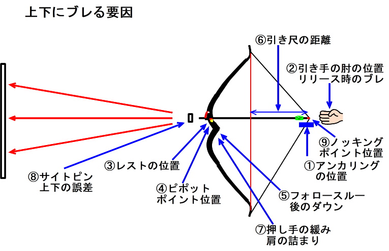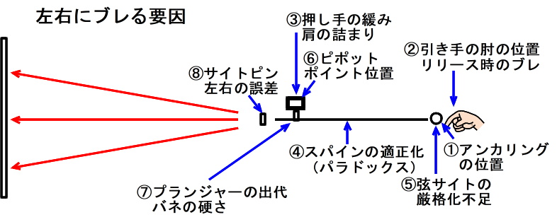 | @アンカリングの位置 アンカリングは上述の上下の位置と左右の位置の両方があります。具体的には弦が顔の中央に位置する「センターアンカー」と「やや側面の「サイドアンカー」に分けられます。どちらが正解という事は無く個人の顔の特徴と押し手の肘の位置(猿腕とか)で決まってきます。言える事は毎回同じ位置で狙うという事です。しかし初心者では弦がアームプロテクターに当たるとかの理由で,、なかなか難しいですが最後は必ず決める事です。弦がアームプロテクターに往路当たる(バシッと痛い)のはNGですが、復路(ポンと当たる)は逆に押し手と弦と引き手の三角形がより狭角になるので良しとします。 A引き手の肘の位置 リリース時のブレ 引き手の肩の筋力が弱いと弦は引っ張られるので耐えられずに肘が上方に上がります。この位置では取りかけが垂直に働かずに、しかも弦が持ち上げられるのでリリースの反動で下方へと矢が飛んでいきます。肩が上がる人はポンドを下げるか筋トレするしかないです。 B押し手の緩み 肩の詰まり 上下の時と同じで、押し手が緩んでいたり、肩が上がって詰まっていると毎回リリース時にブレます。これもAの引き手と同じでポンドを下げるか筋トレするしかないです。 Cスパインの適正化 ご自身のポンドと矢尺でスパイン値が決定してきます。数ポンドあるいは矢尺1インチでワンランク違ってきます。初心者は矢は長めに作り、筋トレをして将来的にポンドを上げても少しカットして短くすれば(スパイン値は小さくなる)スパイン値が適正になる事もあります。また逆にクリッカーを装着すれば矢尺はもっとシビアになります(つまり作り替えを余儀なくされる)。 D弦サイトの厳格化不足 このホームページのタイトルである弦サイトですが、紹介解説コーナーにあるように早く自身の位置を決め毎回同じように厳格化させる事が重要です。 Eピポットポイント 上下と同じで押し手のハンドルの位置をぐらつかないように安定させるポジションを早く掴み毎回一定に同じ位置にさせます。人によっては粘度で盛ったり、ハンドルのグリップのみをしっくりとする物へと交換したりする事もあります。 Fプランジャーの出代 バネの硬さ パラドックスを解消するためにプランジャーが発明されましたが、この出代とバネの強さで微妙に矢を左右に刺さる事を変化させる事も可能です。限界はありますが、ベアシャフトのチューニング次第では調整もあり得ます。 Gサイトピン左右の誤差 上記上下の時と同じです。上記弦サイトの厳格化とエイミング時の保持が重要です。 |