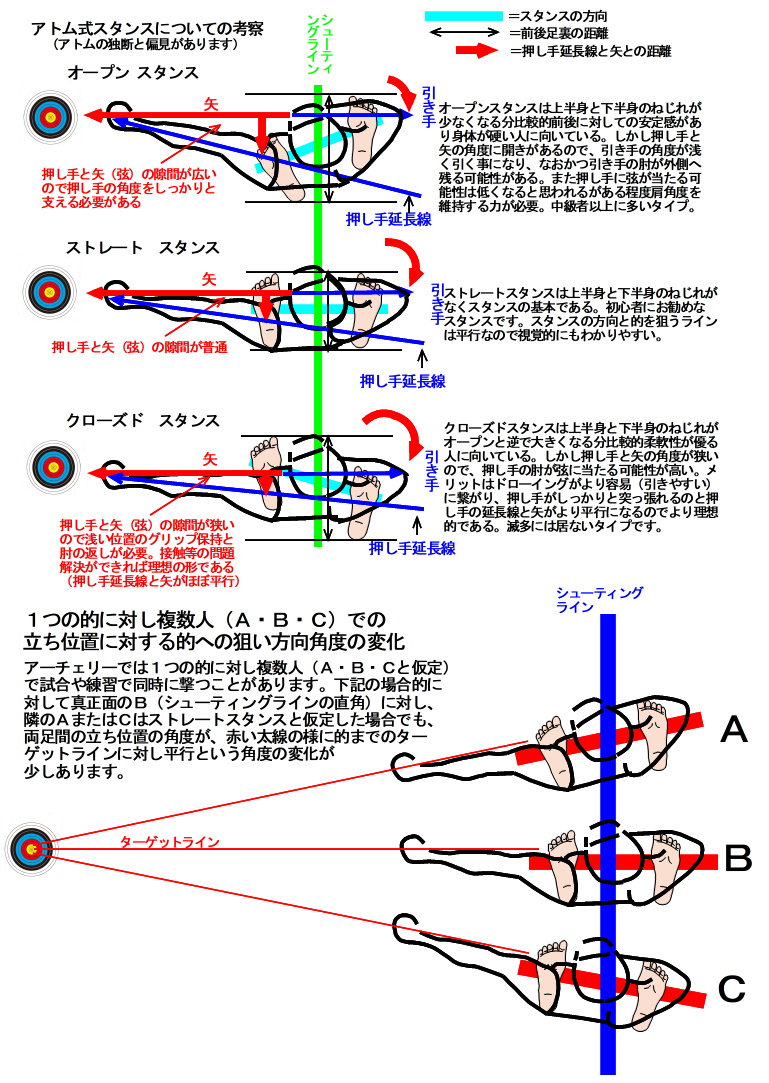 | アーチェリーは矢をつがえて的に向かって放つのは非常に簡単です。まぐれでたまたま10点に刺さる事もありますが、毎回10点(36射360点)というのはかなりの実力が無いと無理です(距離によるが)。初心者が中級レベルへとステップアップするためには色々な注意すべき要因が絡んでいます。ここではその要素を羅列して説明していきます。 アトム自身が感じる一番重要な事は「押し手と引き手の肩の位置」と「リリース」だと思います。おそらく的に当たらない理由の7割を占めるのでは無いかと思います。それができない理由の大半は自在にコントロール出来る筋力の不足です。 |