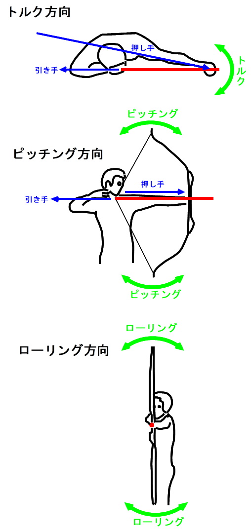 | アーチェリーの弓の保持は台に固定ではないので、やはり押し手の力強い保持と安定性が必要です。引き手も必ず矢の延長線上に位置しなければ、リリース後のショックで微妙にずれその結果弓はブレてしまいます。それを防ぐためには筋力アップと安定器であるセンタースタビライザー・サイドバー・ウエイト等が有効で、ショックを吸収するダンパーやより重心の位置を的側に移動させられるエクステンション(M)ロッドの装着も有効です。しかしそれはより遠方の重量と保持とは相反するので、余裕を持った重さと筋力アップは不可欠です。 下記図はブレる方向を図式化したものです。 |