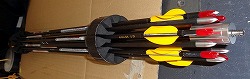 矢を収納するときに使うゴムホルダーで、中央にポンチで25ミリ径の穴をあけ、センタースタビライザーを挿入し、矢は横から填めるタイプなのでそのままだと抜けるので、外周に黒いテープを輪状に貼り、矢は交互に刺し込むように入れて保管しています。 この状態でボウリュックの矢筒ケースに挿入しています。 |