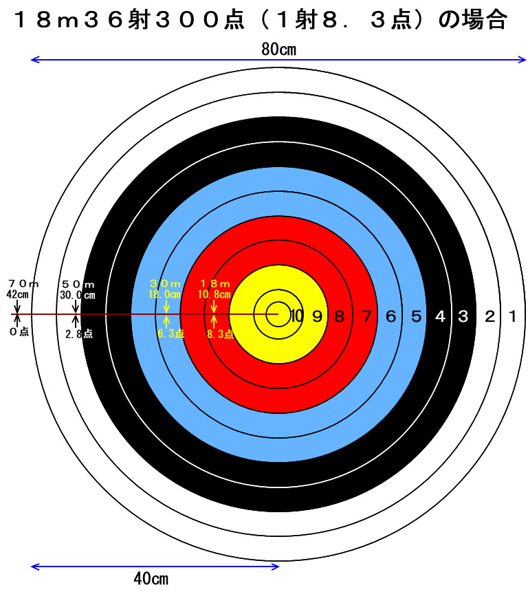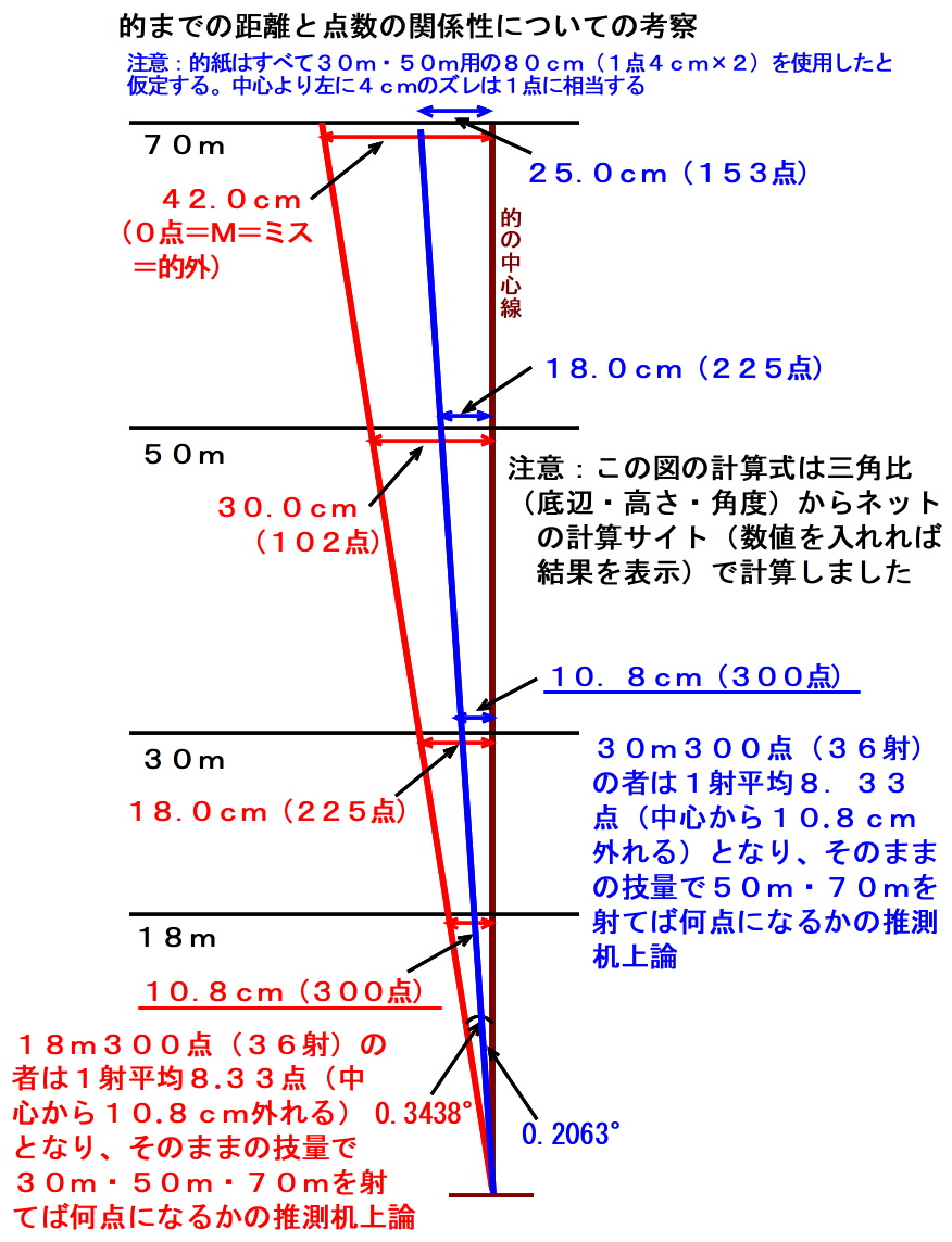 | ここでの机上論は左についてのみ距離の差から点数を割り出すことにしました(上下は無視)。注意に書いてある通り、全ての的紙は80cm(1点8cm)用を使用したという前提です。計算式はネット上にある高度計算サイトを利用しました。底辺(距離)と高さ(左右のズレ)から角度(θ)を割り出し、そこからその角度のまま距離を変えて射った結果、そのズレ(中心〜外れた距離)を計算してその差の距離を点数に換算しました。ズレた1射の点数×36射=合計点数です(合っていると思うが/汗)。 18m300点の者が70mを射って合計点が0点となっていますが、実際には何本かは的紙に当たりプラスの点数は有ると思います。1射平均0点×36射=0点と解釈して下さい。 アトム自身30mで300点を超えたので50mにチャレンジし、何回かサイトの調節をし後日36射の合計点が228点(ミス2回あり)だったのでほぼ合っているかなと思います。感覚としては30mと50mは数倍の難易度があるという感じです。 赤色は18mの距離で300点(36射)平均(8.3点/1射)の者がそのままの角度で30m・50m・70mを射ったら36射で何点になるかを推測した机上論で遊びの延長として捉えて下さい。 青色は30mの距離で300点(36射)平均(8.3点/1射)の者がそのままの角度で50m・70mを射ったら36射で何点になるかを推測した机上論で遊びの延長として捉えて下さい。 |