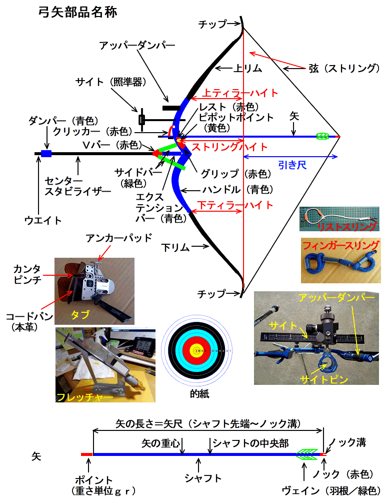弓を構成する重要なパーツで、板バネの形状を持ち、ハンドルの上部にはめ込む方をアッパー(upper)リムと呼び、下部にはめ込む方をロアー(lower)リムと呼ぶ |